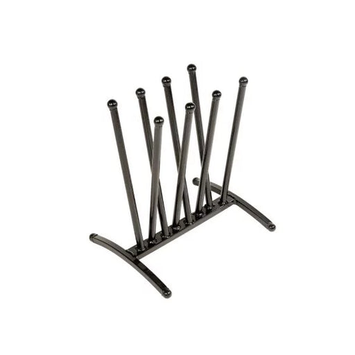 MackeyStylish, yet minimal floor space required for this compact, free standing rack. Solid wrought iron safety knobs and feet on a tubular steel frame, ...